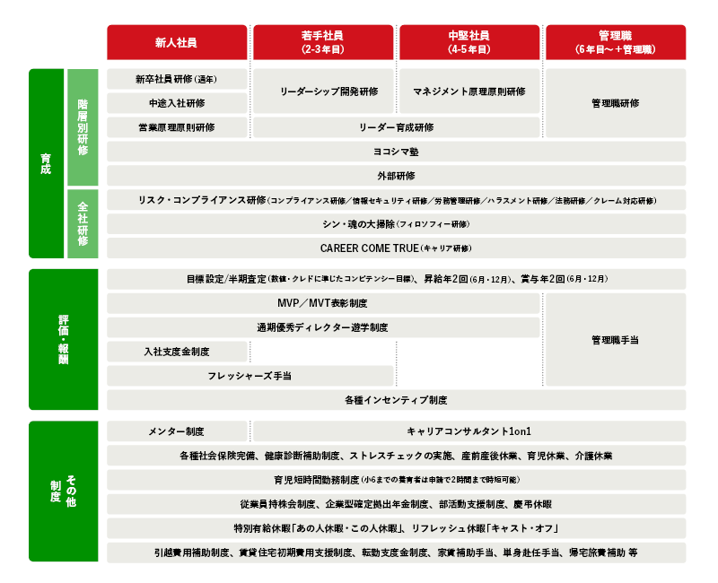 ・年次別・階層別・役職別研修、代表による研修(ヨコシマ塾)、次世代幹部候補育成研修などの社内オリジナル研修の実施